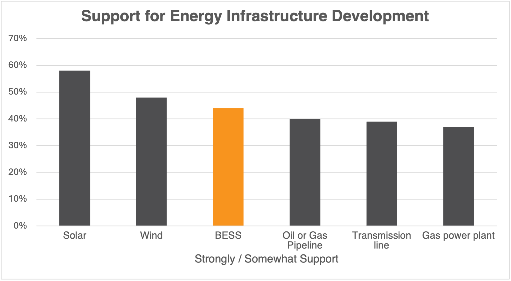 When Arizona residents were asked about their support for different types of energy infrastructure, battery storage (44 percent support) beat out oil and gas pipelines (40 percent), transmission lines (39 percent), and gas power plants (37 percent). 65 percent said they think battery storage provides more benefits than problems.